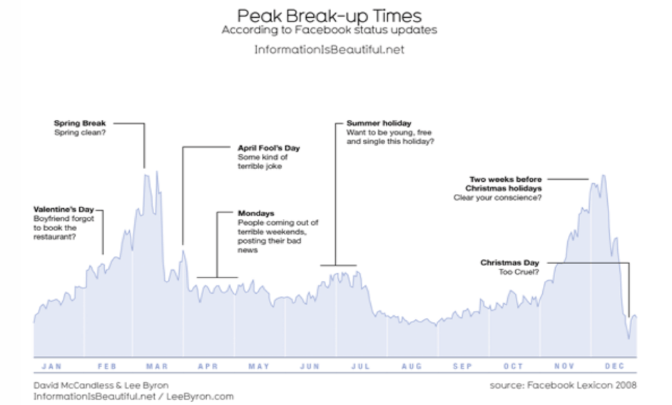 Breakups increase after New Year’s and reach peak a few weeks into March.